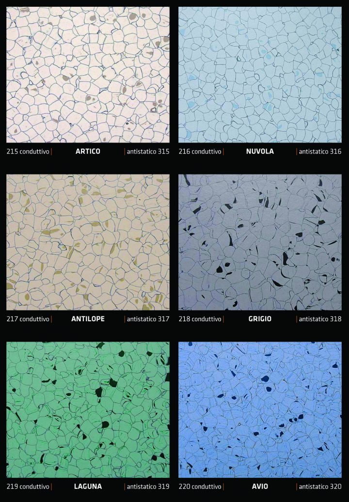 Mescolanza omogenea di resine viniliche, plastificanti, coloranti, cariche minerali ed additivi inorganici particolari che rendono il materiale conduttivo o antistatico. Marmorizzazione passante in tutto lo spessore. Lavorazione eseguita a pressa senza l’impiego di calandre. Idoneo per traffico intenso.